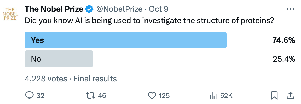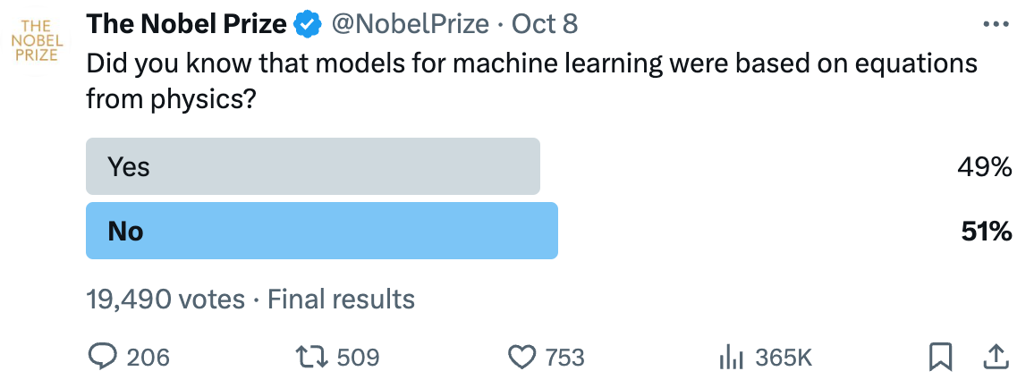 似乎早已预料到公众的热议,在公布结果之后,诺贝尔奖官推还发起了两则投票[3][4],强调人工智能与基础科学之间的互动,以此解释本届颁奖的合理性。